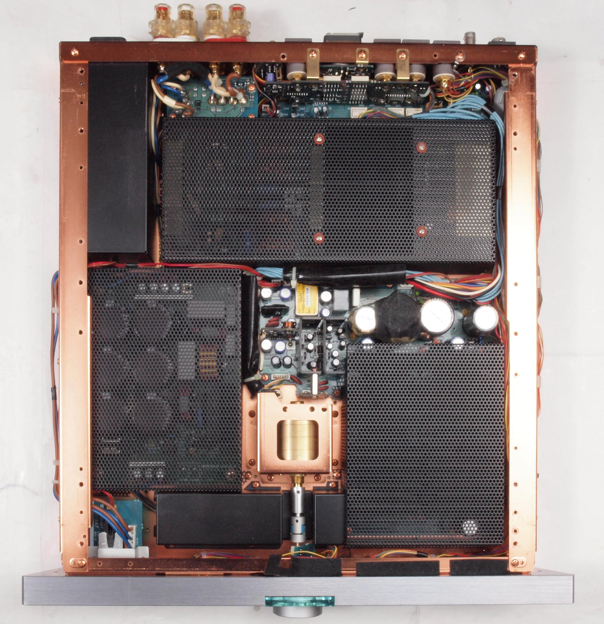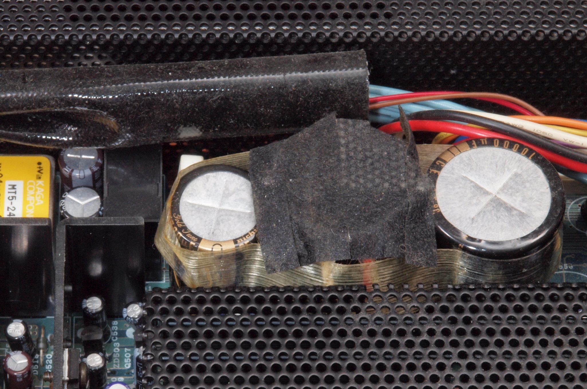 | A23. 点検中 上下蓋・左右パネル・センターブース・左右パネル押さえを取り、上から見る。DC-DC電源基板の電解コンデンサー頭。 |