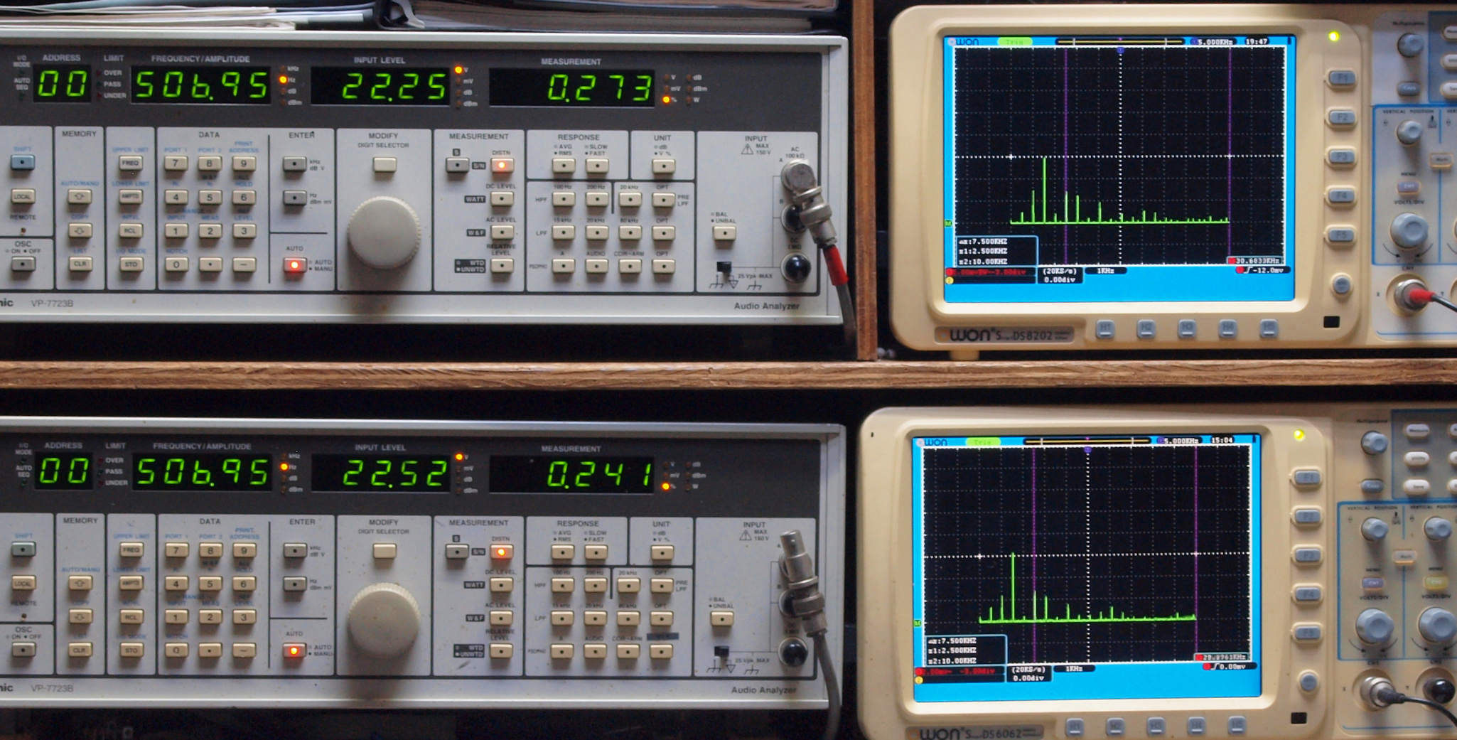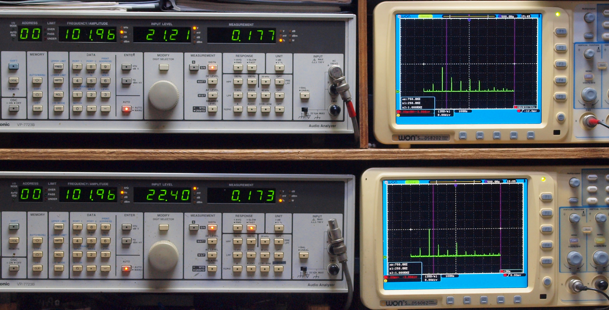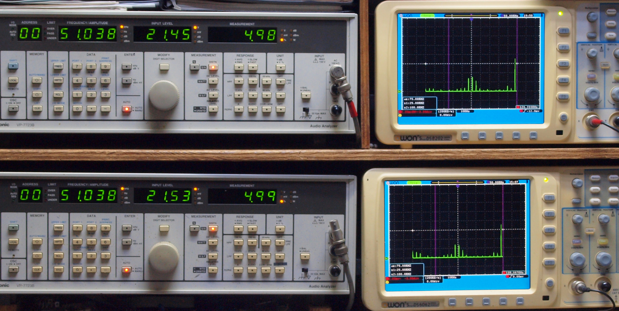 | E. 測定・調整。 画像をクリックすると、大きく(横幅2050ドット)表示されます。 E0. 出力・歪み率測定・調整 「見方」。 上段中 右側SP出力を「Audio Analyzer Panasonic VP−7723B」により測定。 表示LED、 左端=メモリーNo、 中左=周波数測定、 中右=出力電圧測定、 右端=歪み率測定。 上段右端 VP−7723Bの基本波除去出力を「owon SDS8202(200MHZ)」で「FFT分析」表示。 下段中 左側SP出力を「Audio Analyzer Panasonic VP−7723B」により測定。 表示LED、 左端=メモリーNo、 中左=周波数測定、 中右=出力電圧測定、 右端=歪み率測定。 下段右端 VP−7723Bの基本波除去出力を「owon SDS6062(200MHZ)」で「FFT分析」表示。 下段左端 オーディオ発振器 VP−7201A より50Hz〜100kHzの信号を出し(歪み率=約0.003%)、ATT+分配器を通し、AMPに入力。 よって、ダイアル設定出力レベルより低なります。測定機器の仕様や整備の様子はこちら、「VP−7723B」「VP−7201A」。 FFT画面の見方はこちら。 |