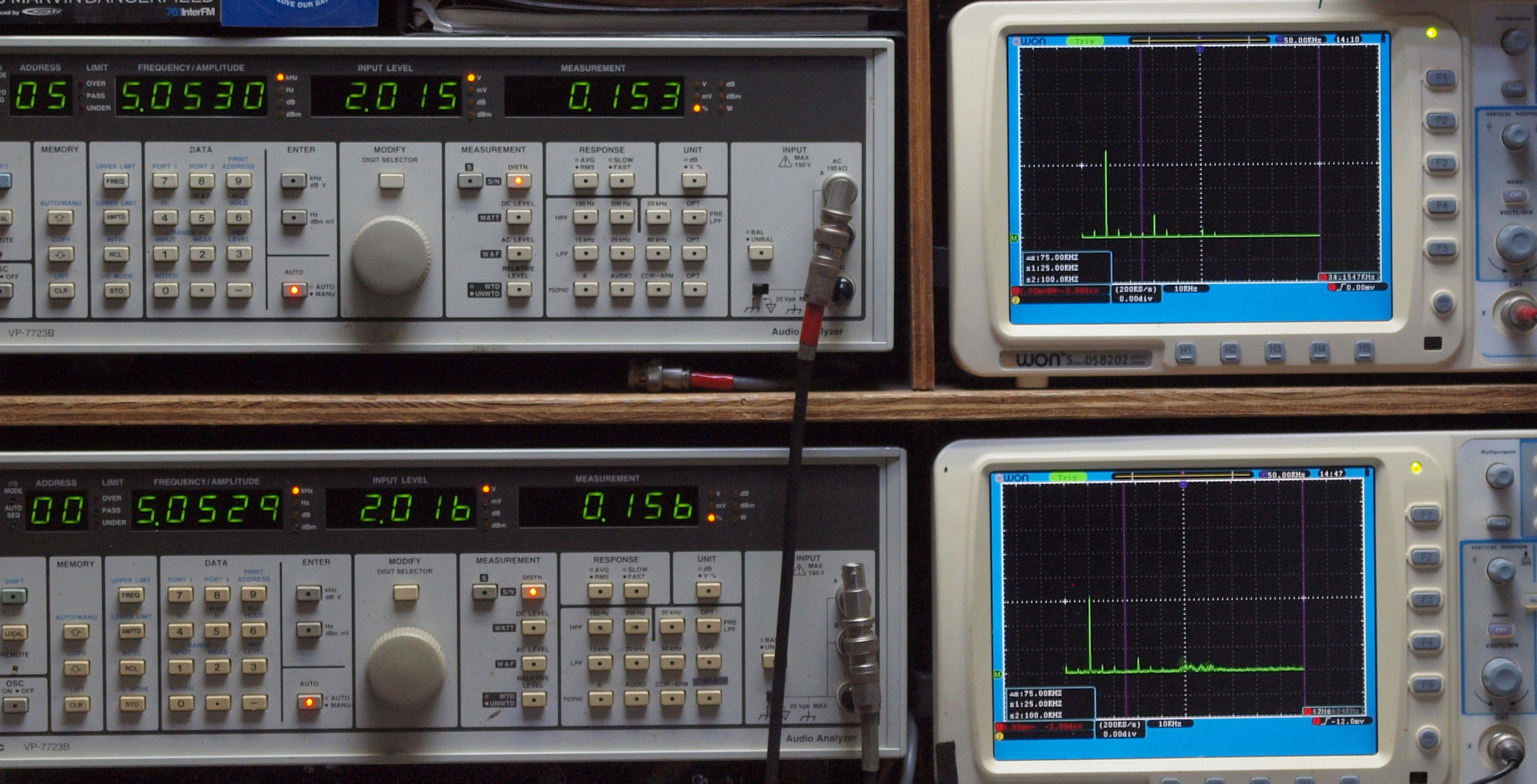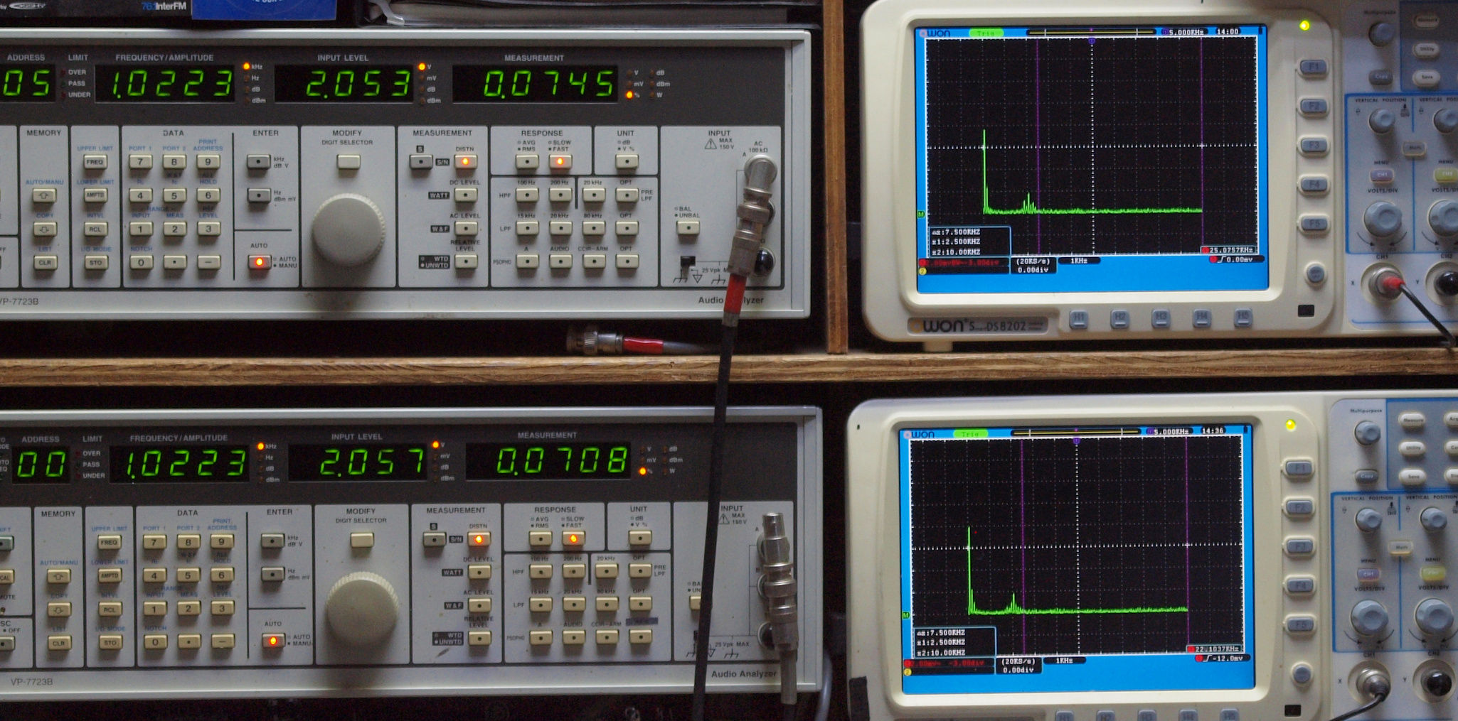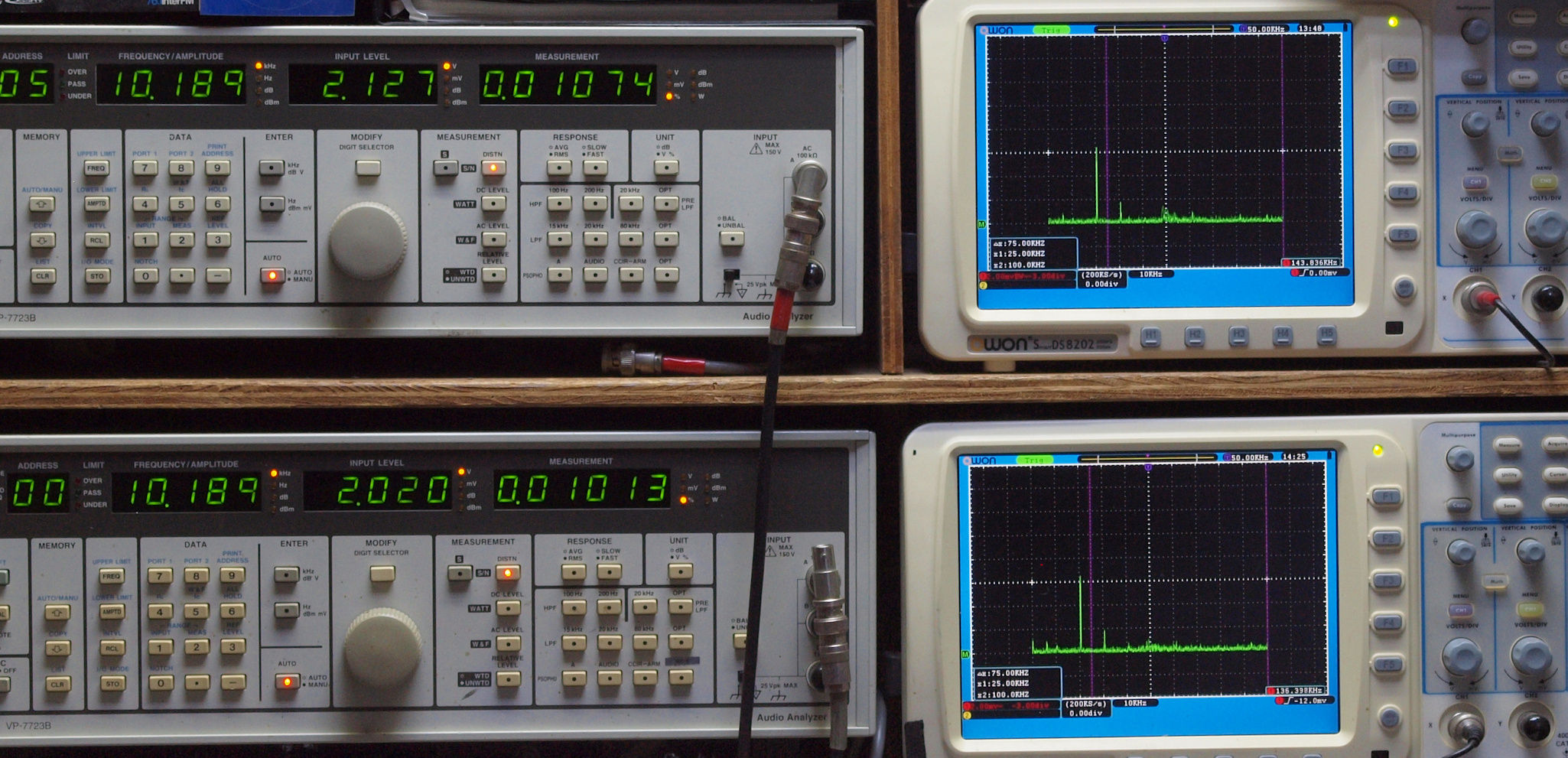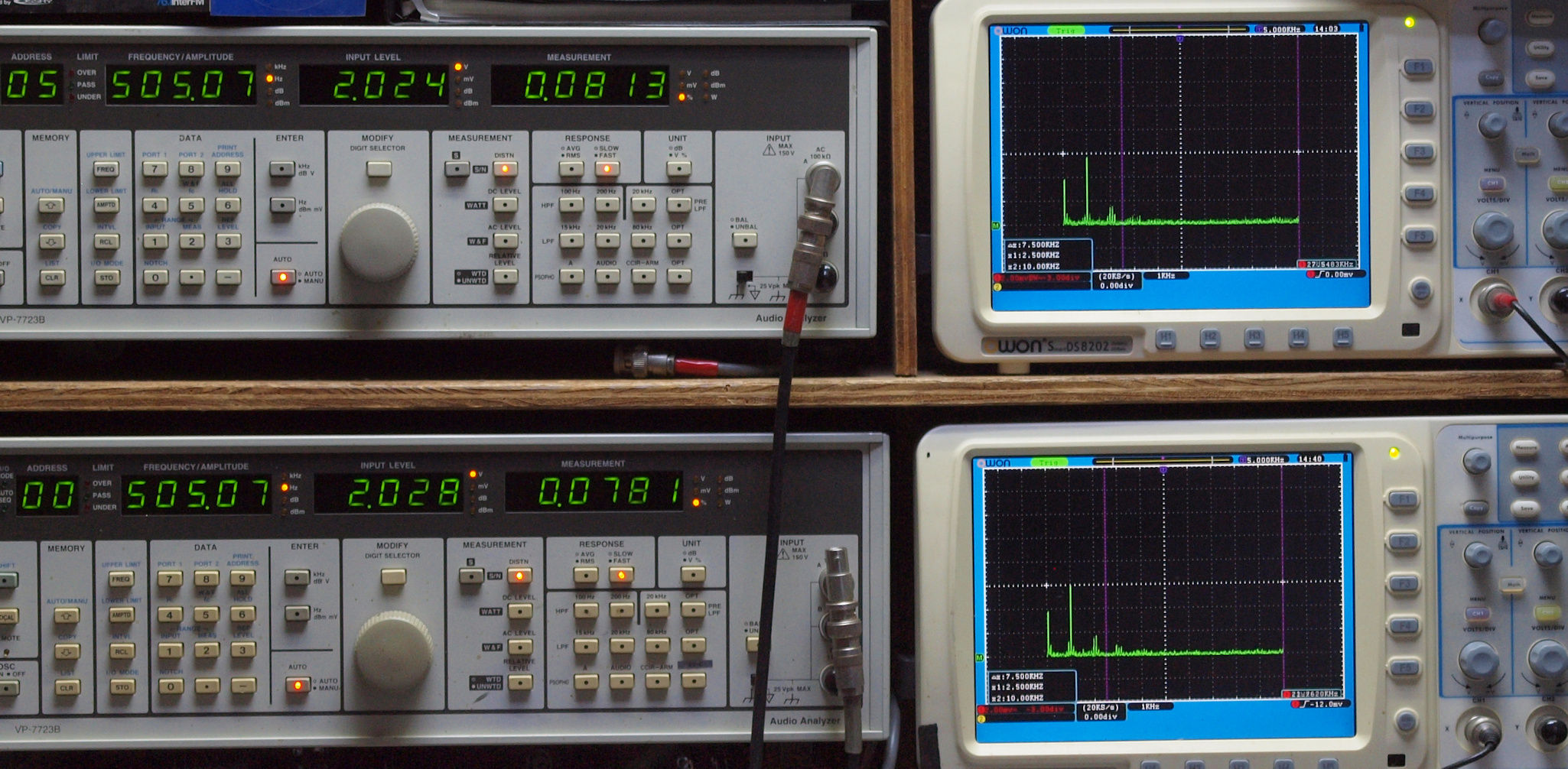 上段右端 VP−7723Bの基本波除去出力を「owon SDS8202(200MHZ)」で「FFT分析」表示。