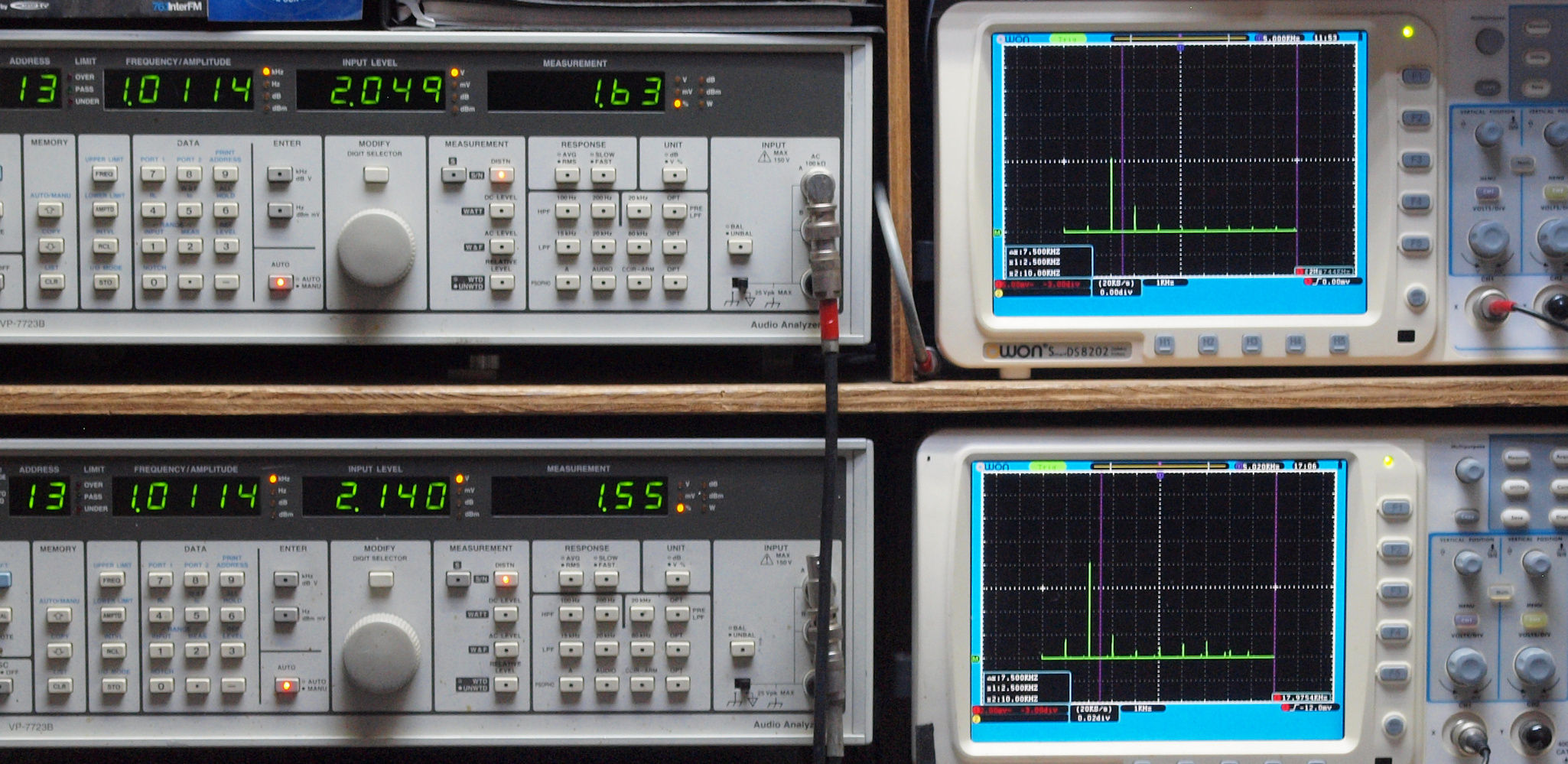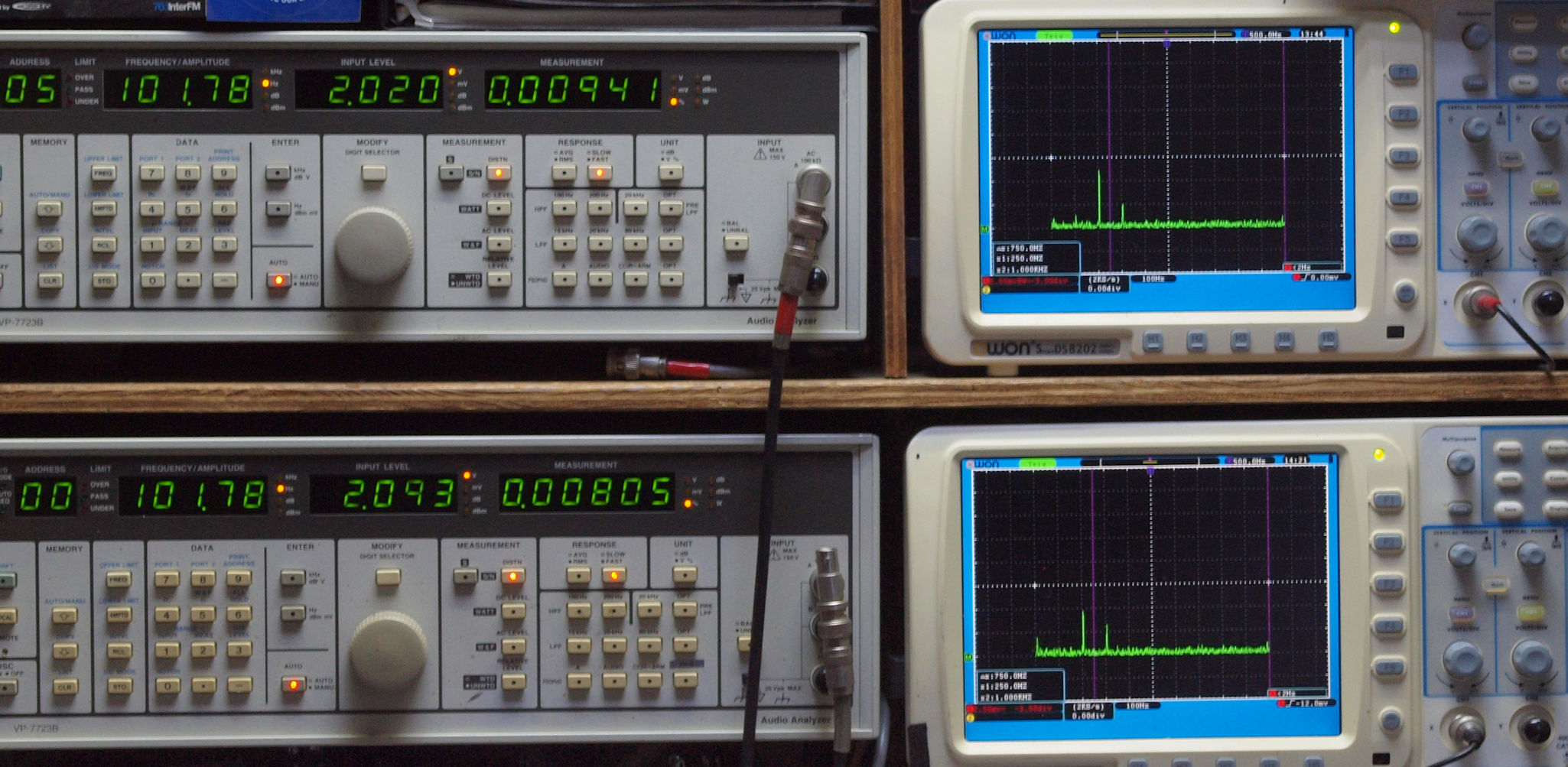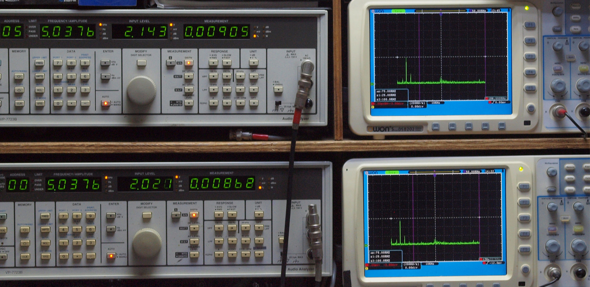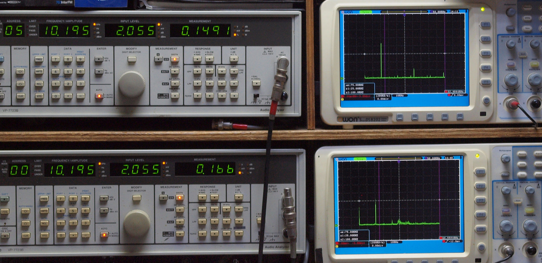 上段右端 VP−7723Bの基本波除去出力を「owon SDS8202(200MHZ)」で「FFT分析」表示。